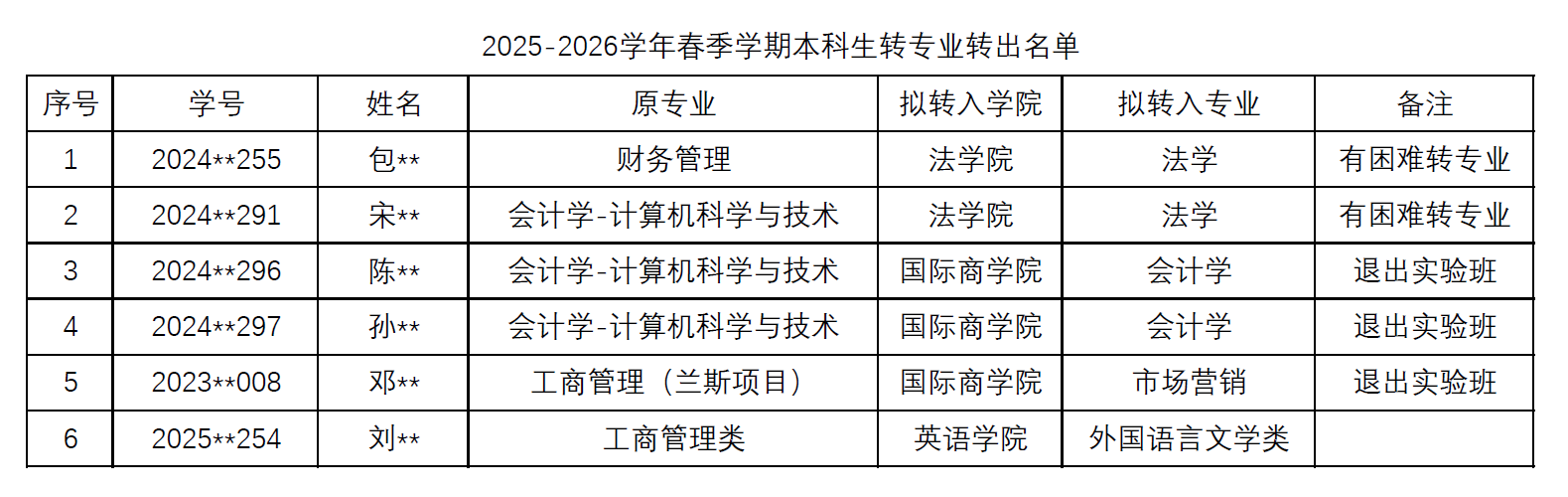 2025-2026学年春季学期国际商学院本科生拟转出学生公示